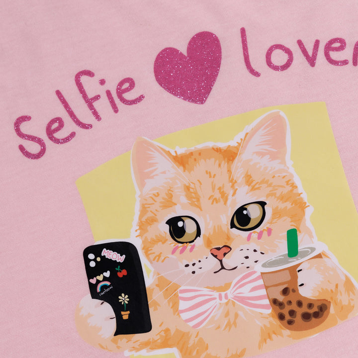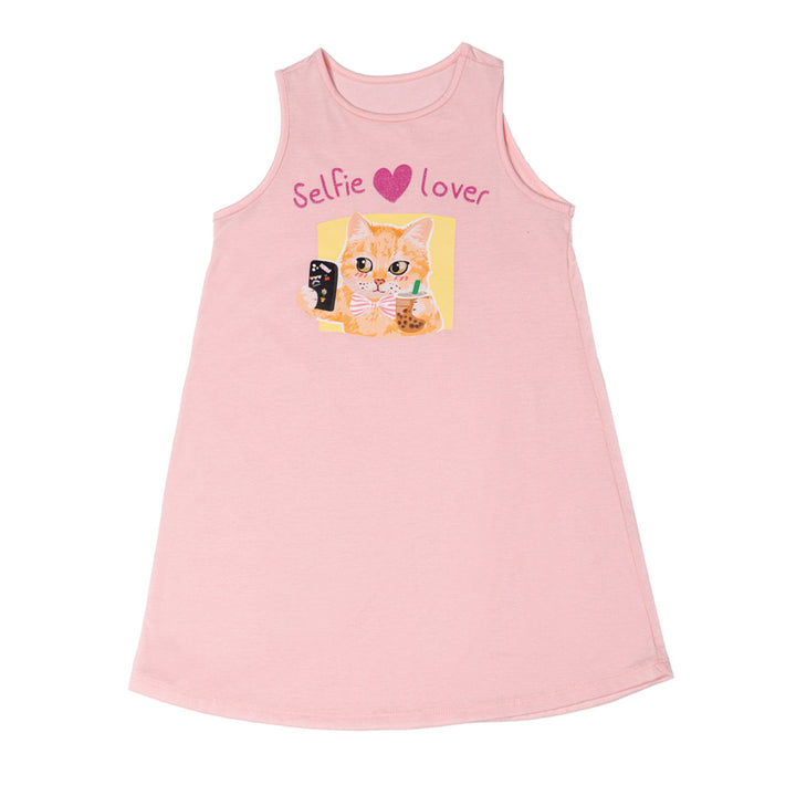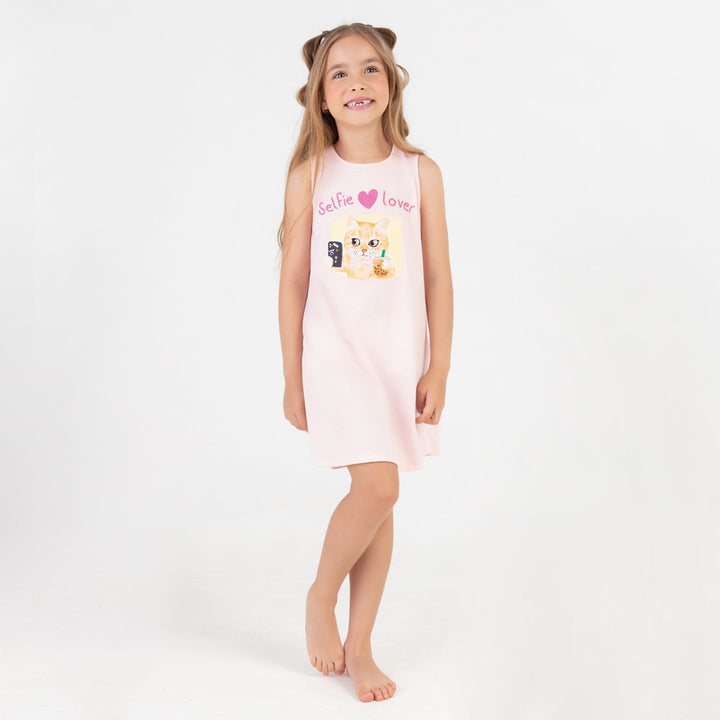 Prepara a tu pequeña para una noche de comodidad y dulces sueños con nuestra encantadora batola para niña. Esta prenda es perfecta para asegurar que tu niña se sienta cómoda y acogedora mientras se relaja en casa. Pijama en batola para niña, manga sisa, cuello redondo, color rosado, estampado de gato con texto y corazón, fucsia en glitter, selfie lover.