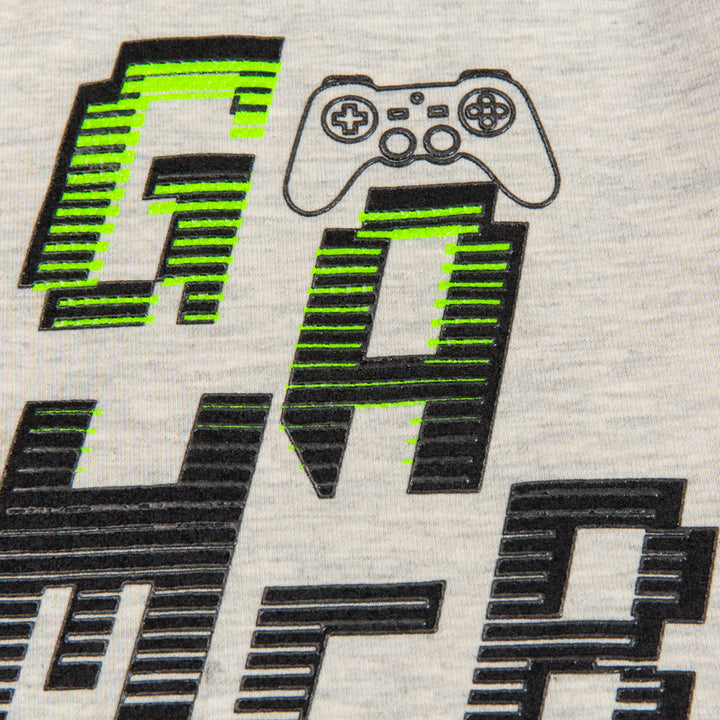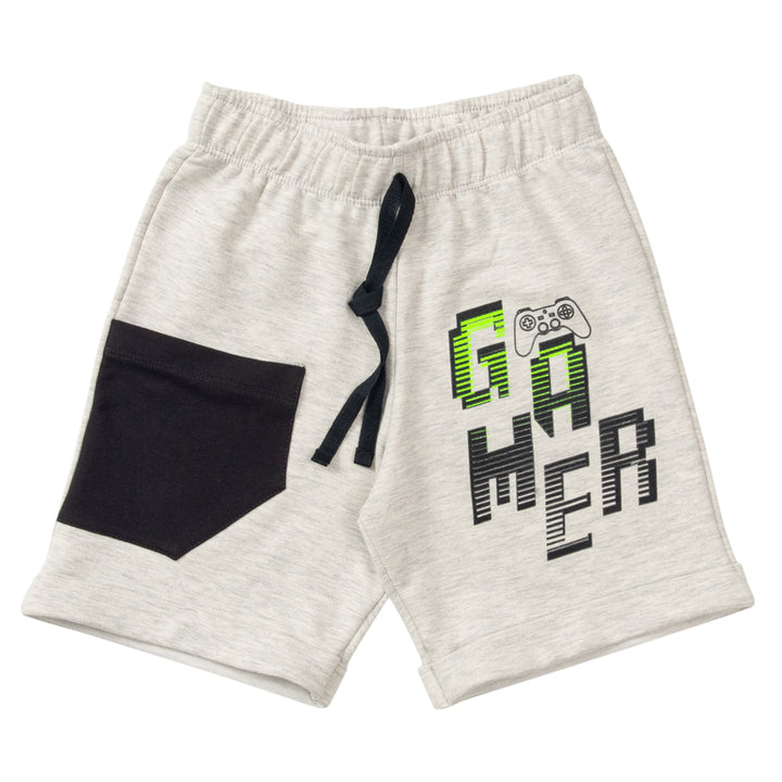 Además de su estilo gamer, esta bermuda está confeccionada con un tejido ligero y transpirable que le permite moverse con libertad y comodidad durante las sesiones de juego más largas. Bermuda para niño, color gris, estampado verde y negro de gamer con control remoto, bolsillo negro, elástico en cintura y cordón negro para amarrar a la medida.