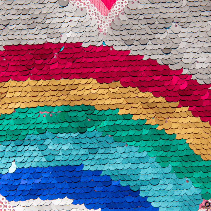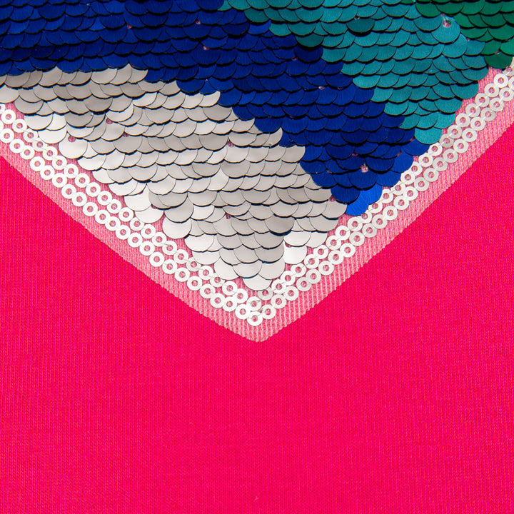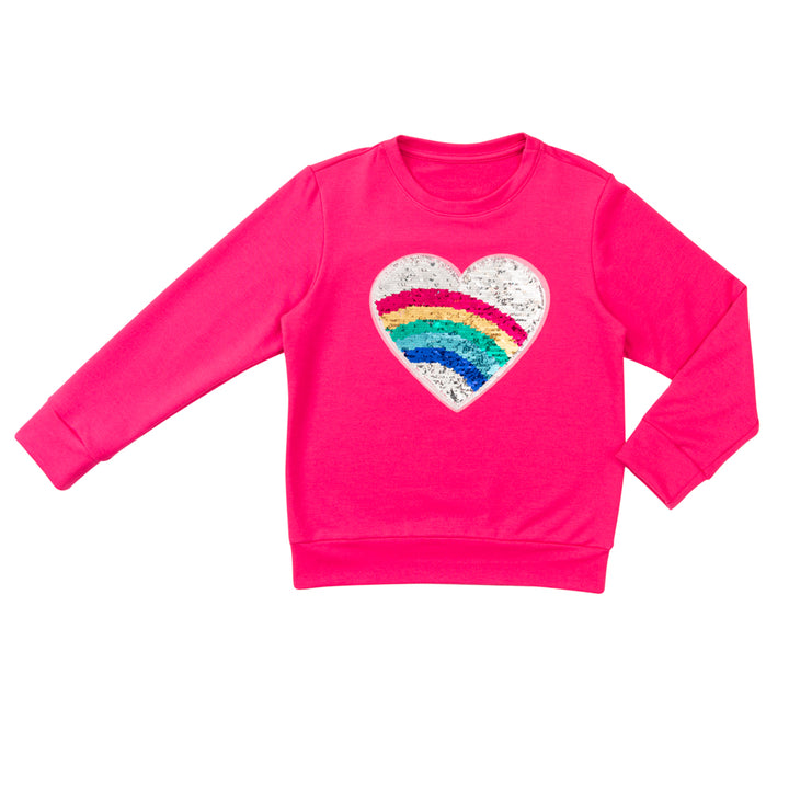 Deslumbra con estilo y brillo con nuestro espectacular buzo para niñas con estampado de apliques en lentejuelas! Este buzo es la elección perfecta para las pequeñas amantes de la moda y el glamour. Cómodo y suave buzo para niña, cuello redondo, color rosado, estampado de corazón arcoíris multicolor con técnica de lentejuelas.