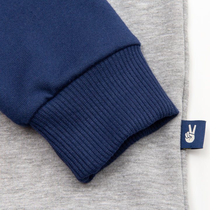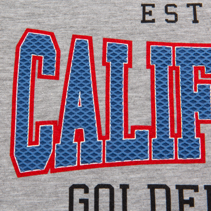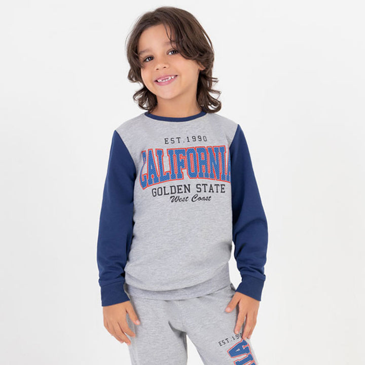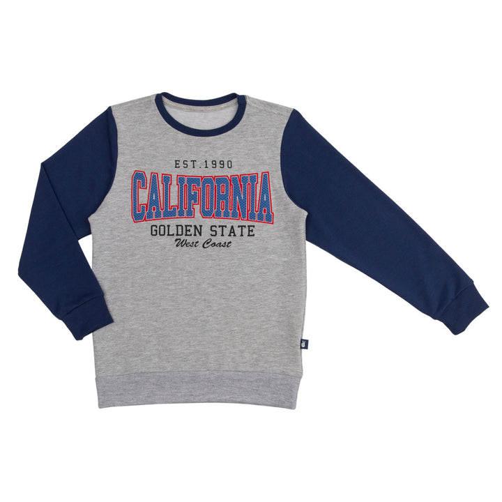 Deja que tu pequeño destaque con elegancia y calidez gracias a este buzo versátil que se adapta a su personalidad activa. Cómodo y suave buzo niño, color gris jaspe, cuello redondo y mangas azules, estampado "CALIFORNIA" con textura en relieve, cuello y puños en rib.