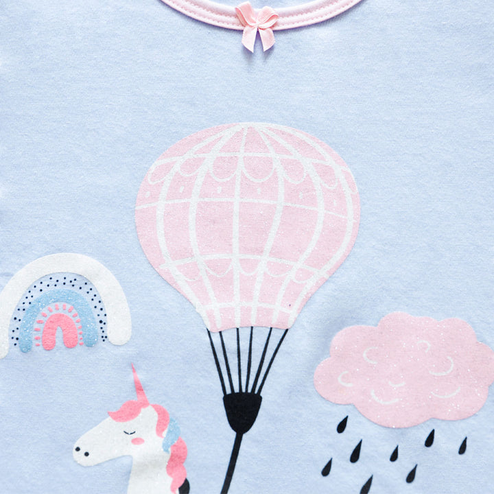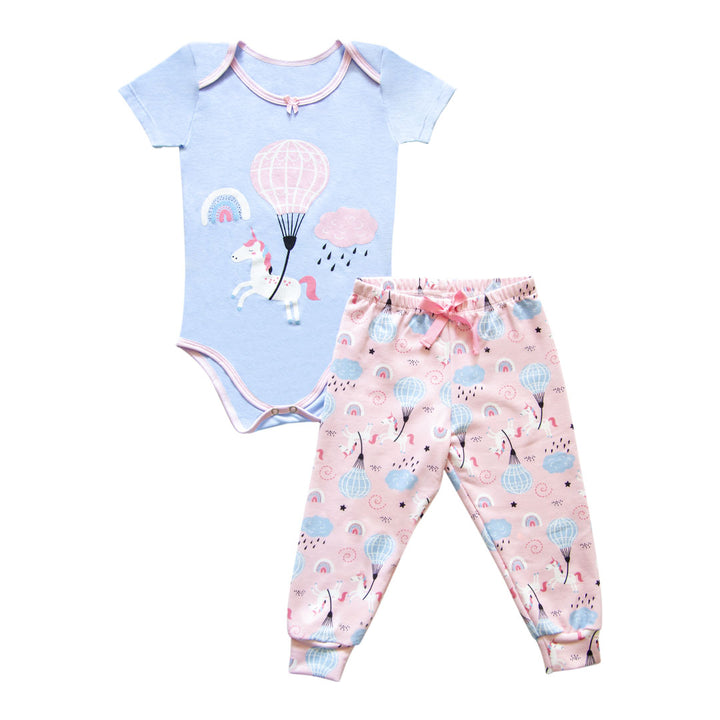 Un conjunto de bebita estampado de unicornio sería una elección encantadora y mágica para tu pequeña princesa. Conjunto para bebita, color celeste. Estampado unicornio.