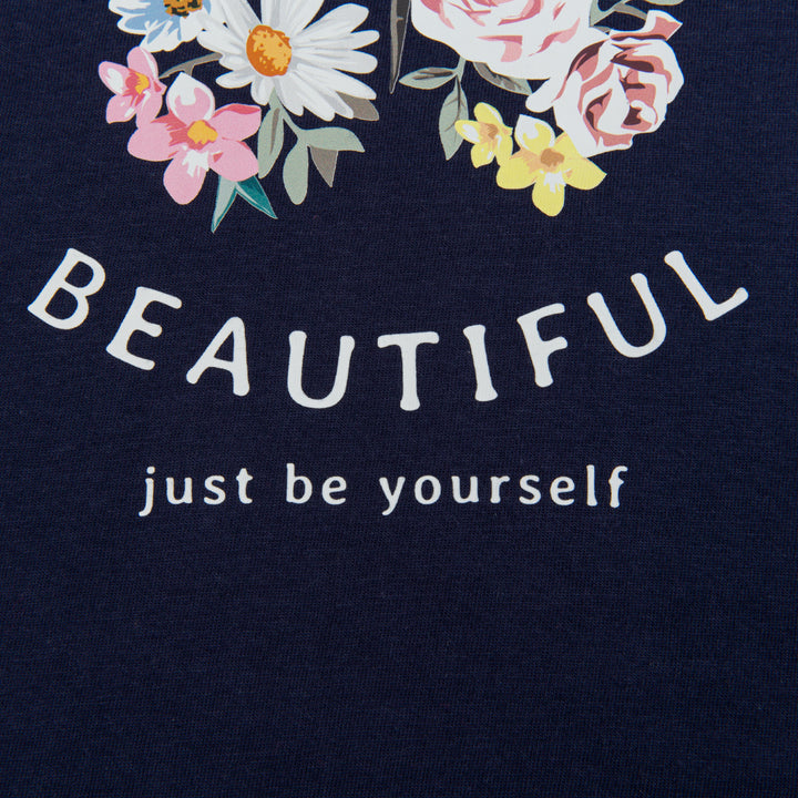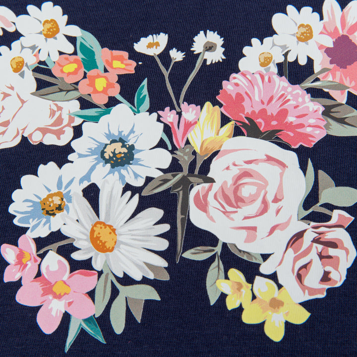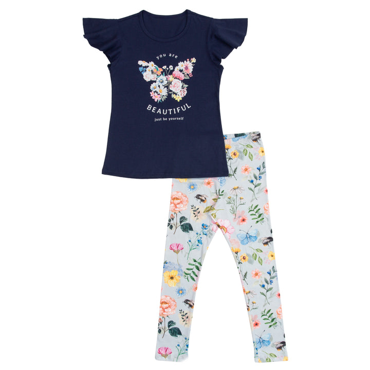 Con una camiseta y pantalón a juego, este conjunto es la elección perfecta para dar un toque de alegría y elegancia a cualquier ocasión. Conjunto para niña, color azul, estampado flores.