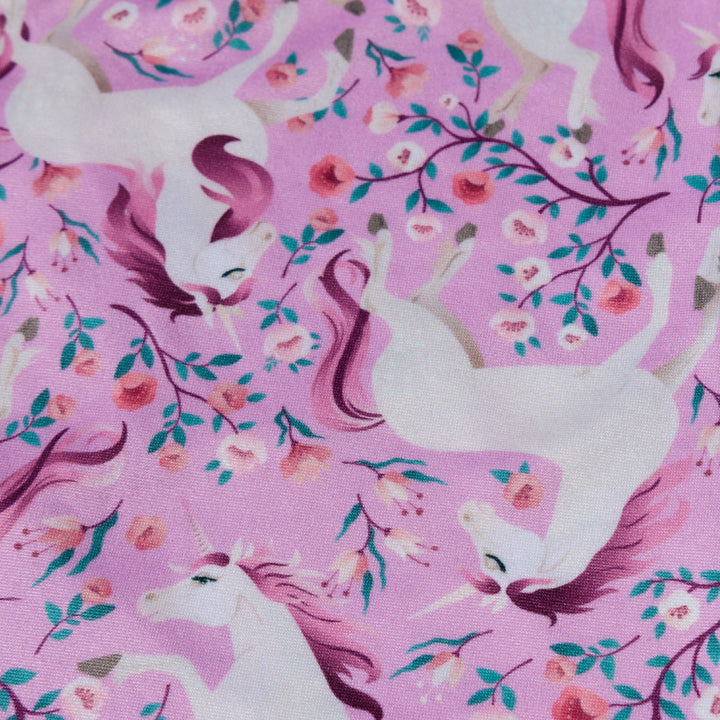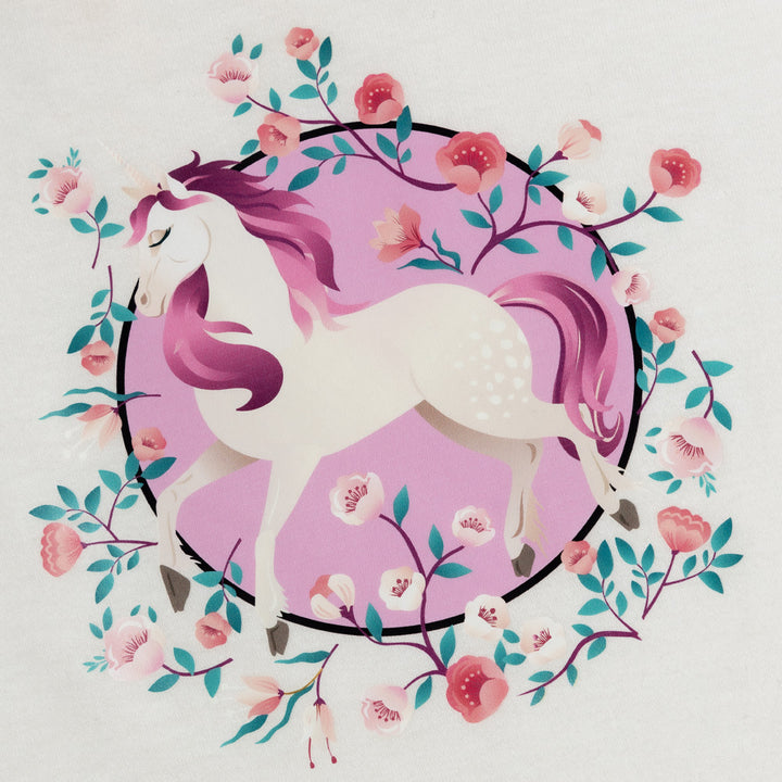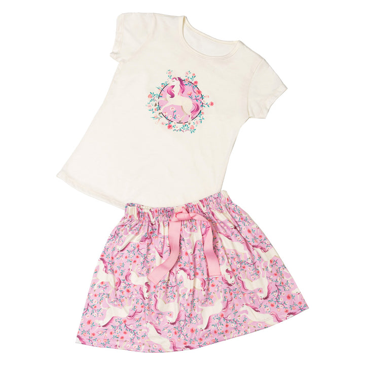 Con una falda que presenta hermosos unicornios y detalles mágicos, tu niña se sentirá como parte de un cuento encantado en cada ocasión especial. Combinada con una camiseta a juego, este conjunto ofrece un estilo único y lleno de gracia. Conjunto corto para niña, color rosado, estampado unicornio.