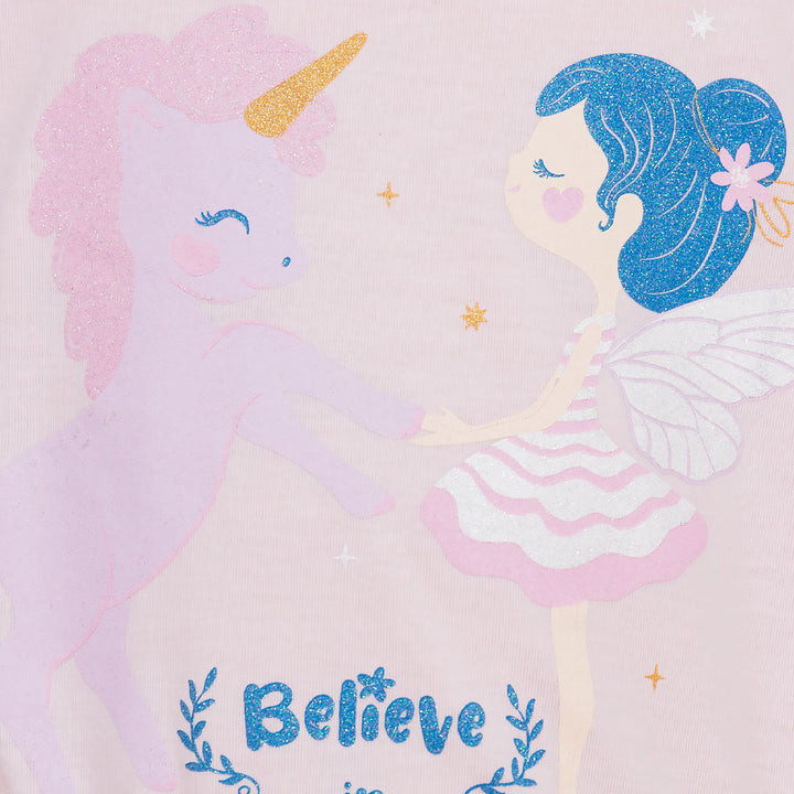 Un conjunto para niña con camiseta rosada y falda de denim sería una opción encantadora y versátil para cualquier ocasión.