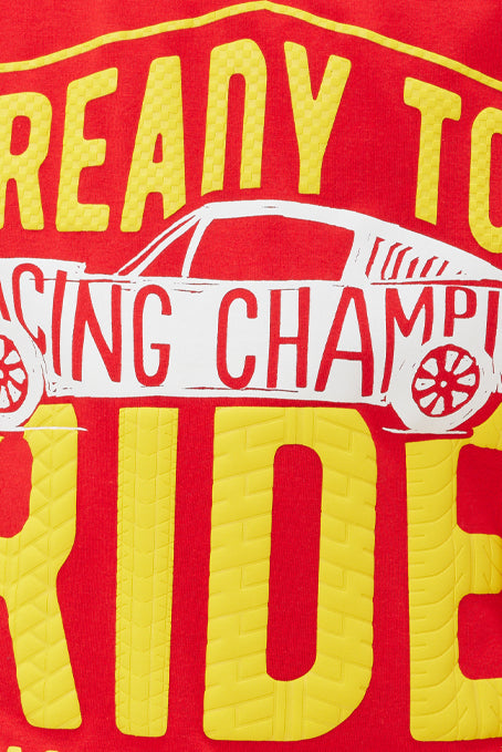 - Una camiseta con fondo rojo y estampado de autos de carreras con detalles de relieve en puff.