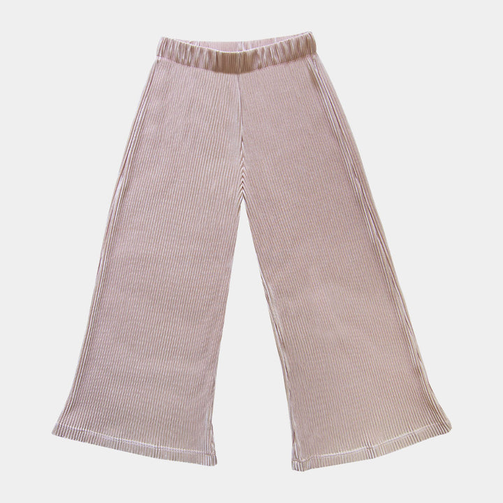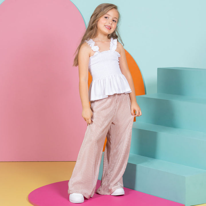 Este pantalón es perfecto para las niñas que buscan estilo y confort en una sola prenda. Con su tejido ligero y fluido, ofrece libertad de movimiento y un ajuste cómodo durante todo el día. Pantalón para niña, color rosado.