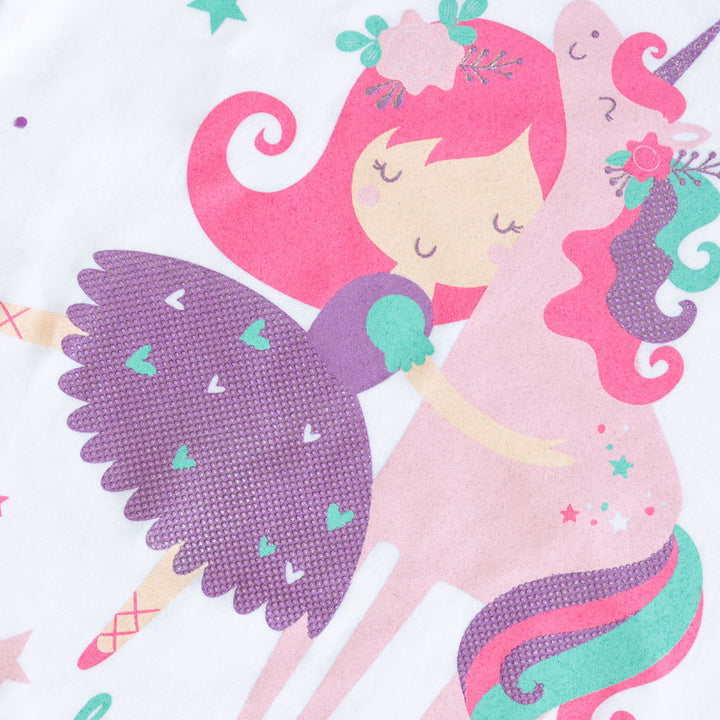 El ajuste cómodo y elástico permite que tu pequeña se mueva con facilidad mientras se sumerge en sus sueños llenos de unicornios. Además, la pijama es fácil de poner y quitar gracias a su diseño práctico y funcional. Pijama para niña, color blanco, estampado unicornio.