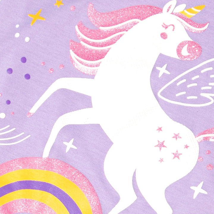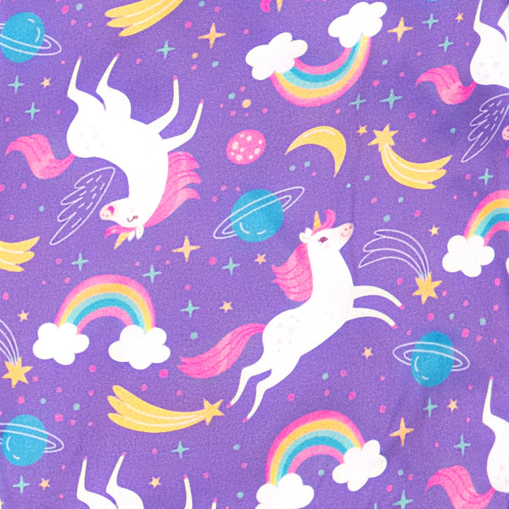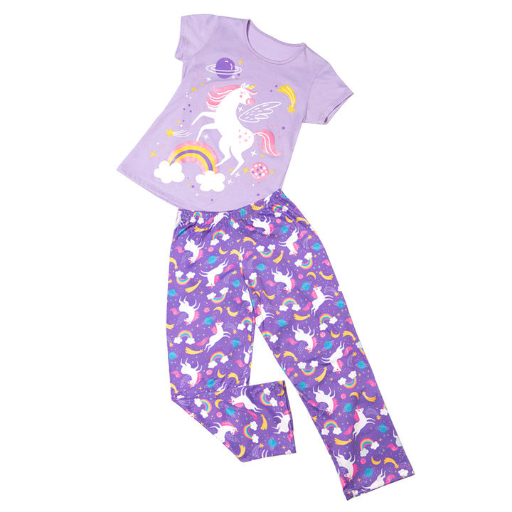 Esta pijama está diseñada para las niñas que sueñan con el mundo mágico de estos seres míticos. Con un diseño que presenta hermosos unicornios y detalles encantadores, tu niña se sentirá como en un cuento de hadas en cada noche. Pijama larga para niña, color morado, estampado unicornio.