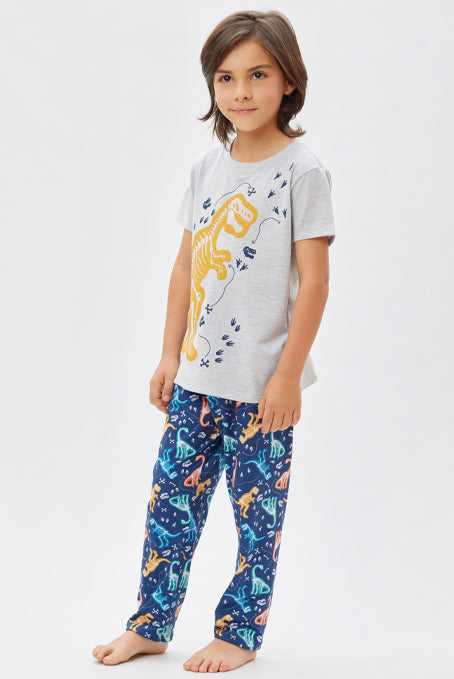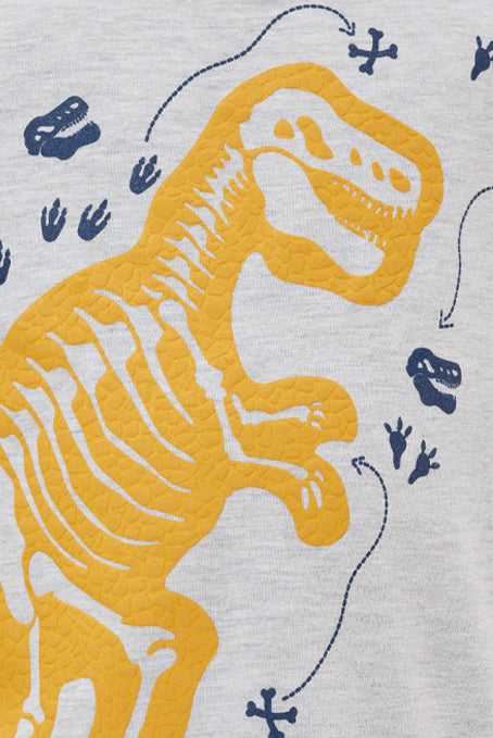 Esta pijama es perfecta para mantener a tu pequeño explorador abrigado y cómodo toda la noche. Confeccionada en un suave y cálido tejido, la camiseta de cuello redondo destaca por un estampado de dinosaurio en alto relieve, añadiendo un toque divertido y único que despertará su imaginación. El pantalón, con un toque elástico, asegura un ajuste cómodo, ideal para acompañar sus grandes sueños.